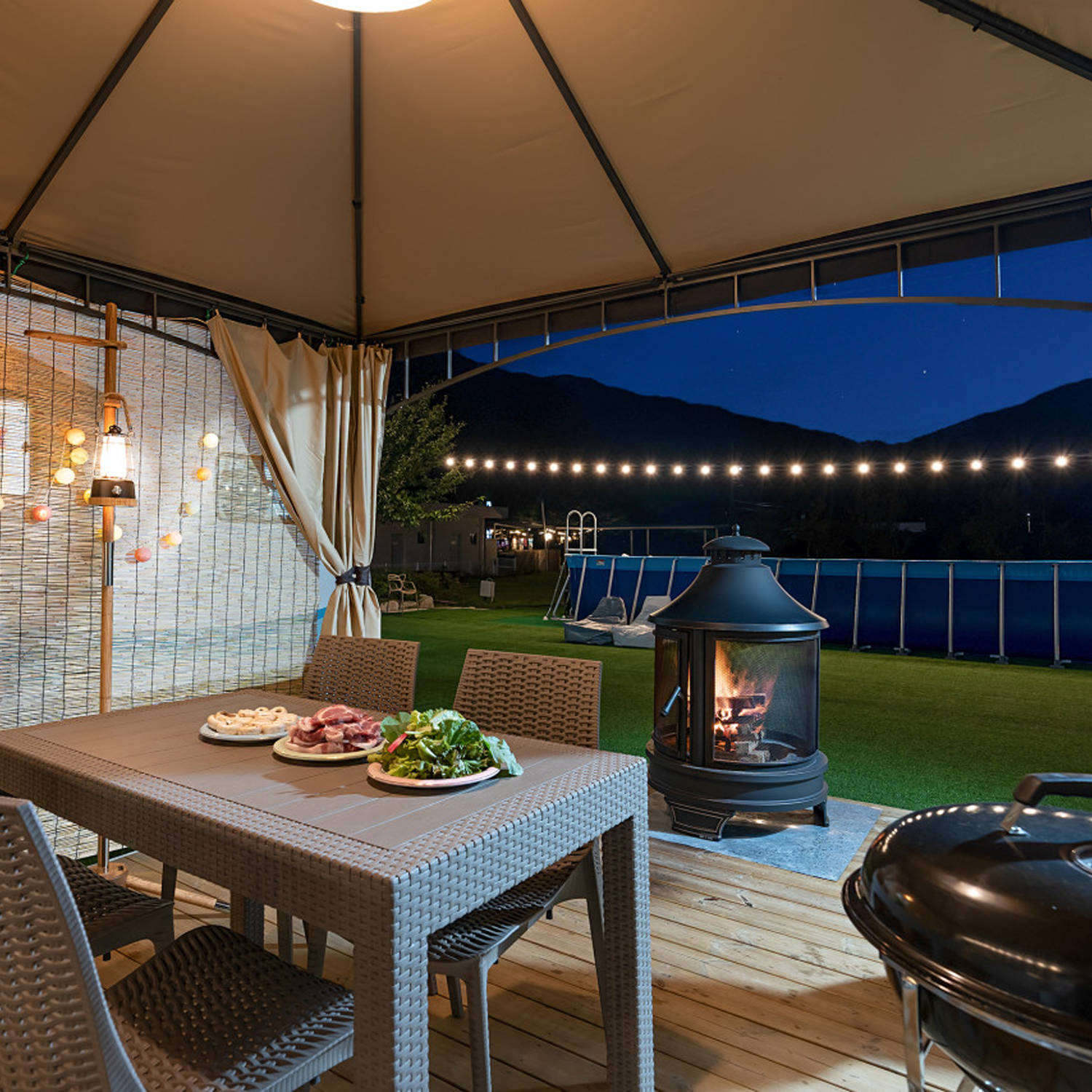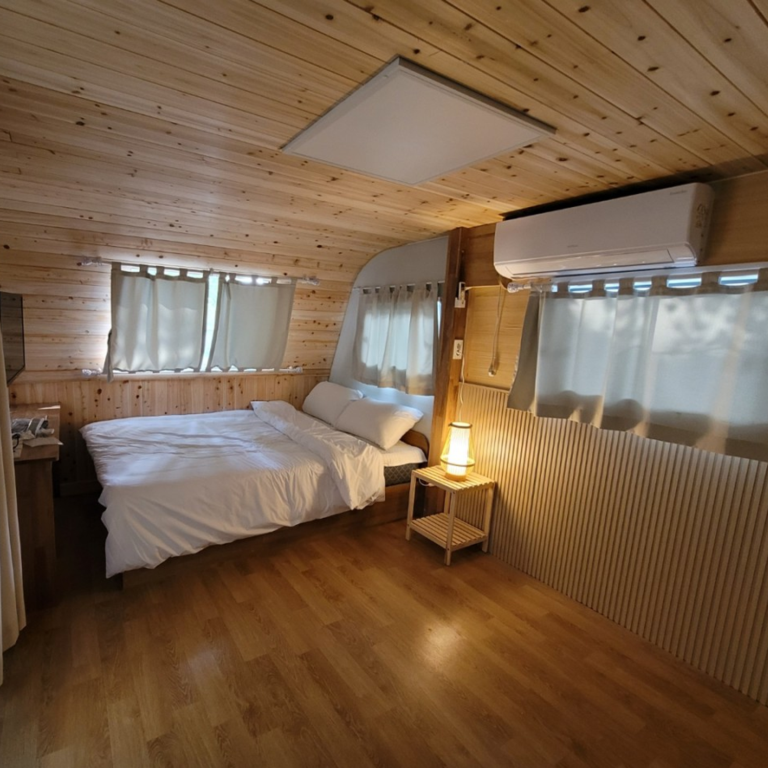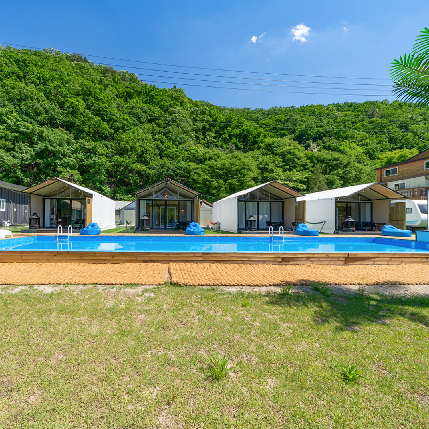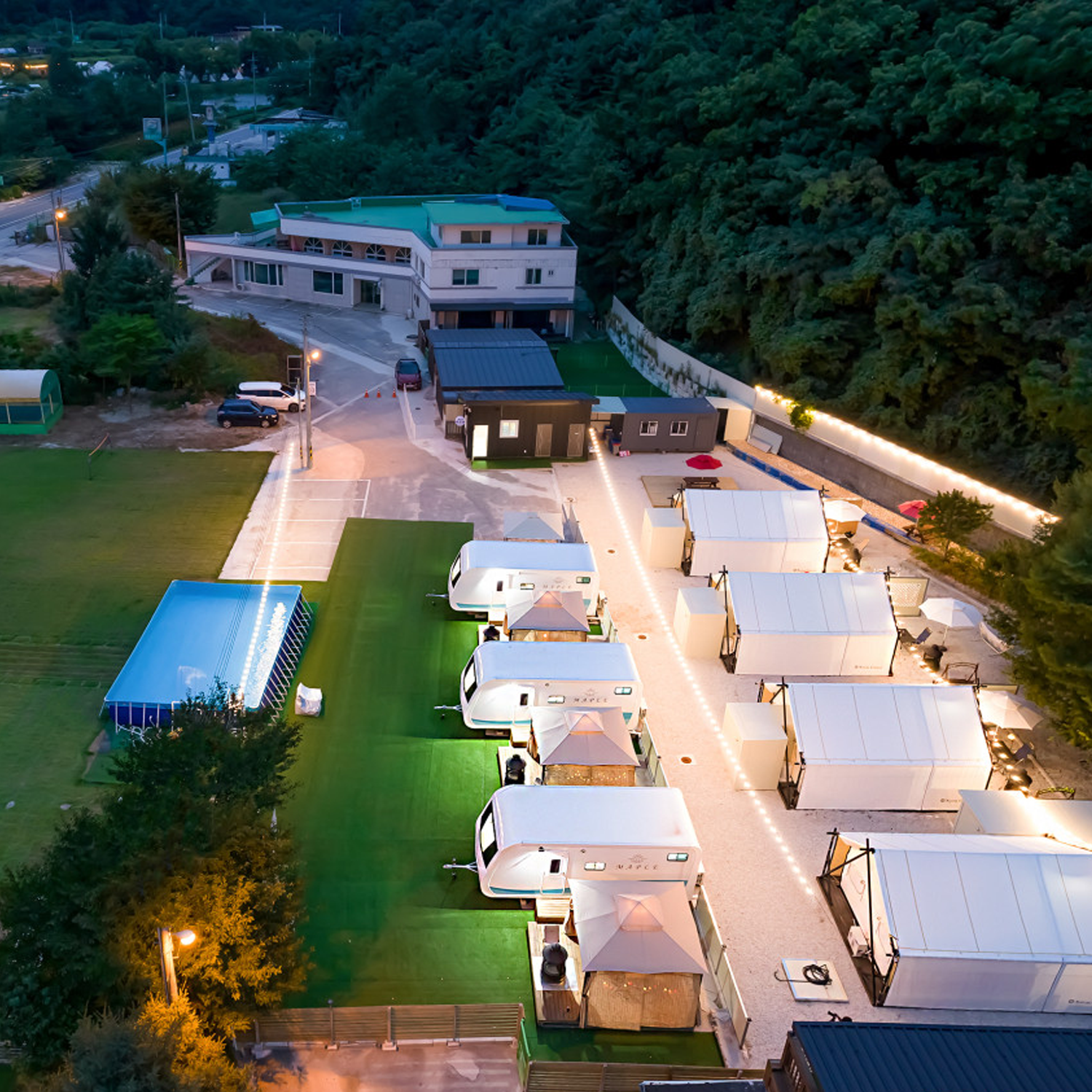 히노끼탕이 있는 빔프로젝터룸부터, 루프탑 독채형 글램핑까지. 메이플글램핑은 선택의 폭이 넓습니다. 매트리스가 꺼질 틈 없이 넓고 포근한 침대, 커피포트와 전자레인지, 야외 테이블과 자쿠지, 그리고 아이들과 놀기 좋은 잔디광장과 트램폴린까지. 물놀이를 잔뜩 한 후, 셀프 바비큐에서 고기를 굽고, 숙소 안에서는 영화 한 편에 맥주 한 잔. 모든 공간이 자연스럽게 연결되어 있어, 한 템포 느린 하루가 완성됩니다. 작은 웨건 서비스 하나에도 호스트의 배려가 느껴지죠.