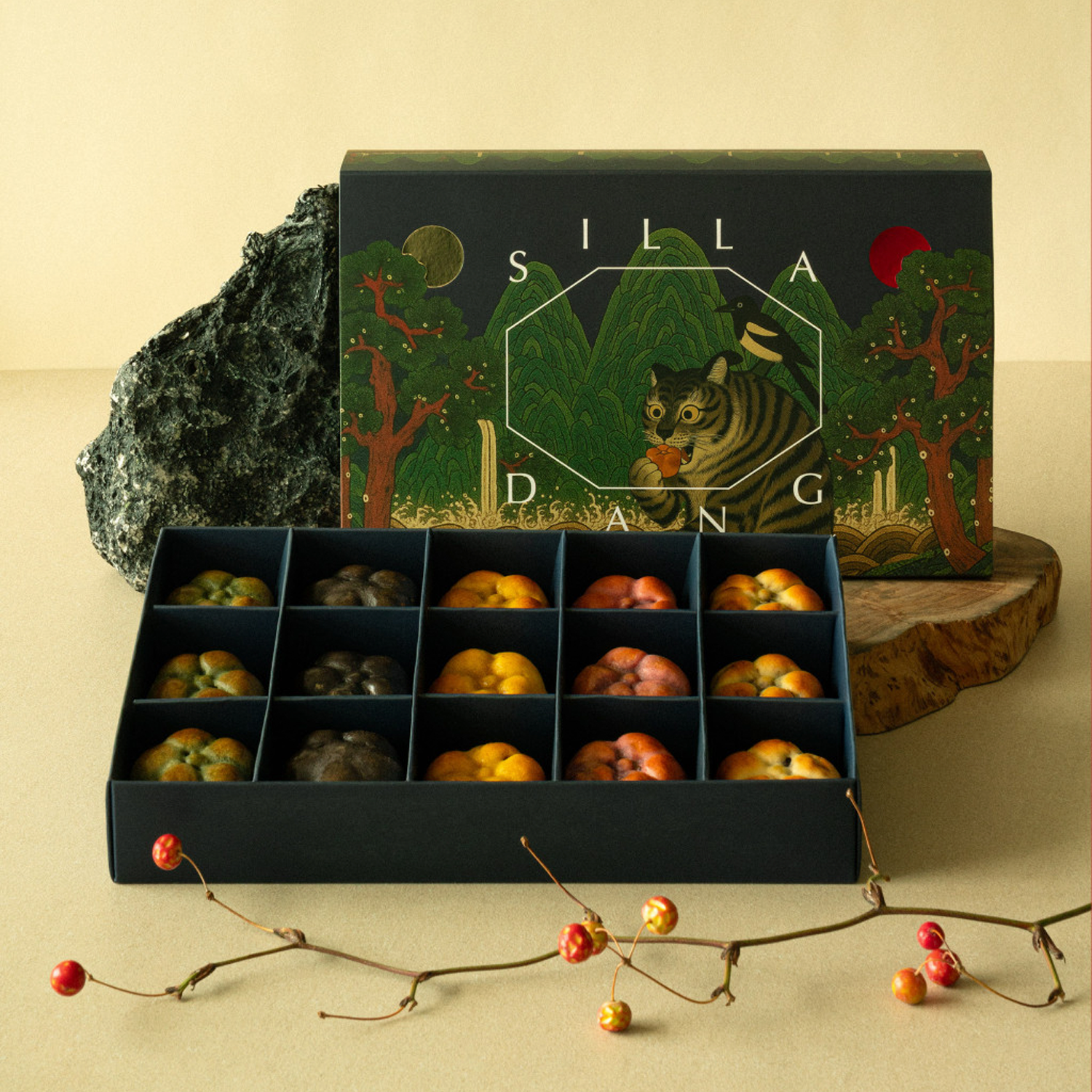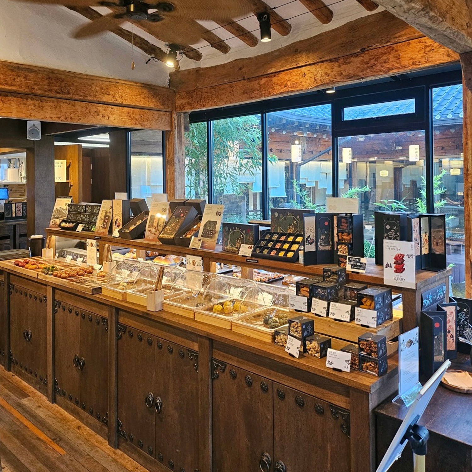 신라당의 진짜 매력은 안으로 들어가면 시작됩니다. 본관과 별관으로 이어지는 공간마다 한옥의 단정한 선을 살린 인테리어가 이어지고, 창가에 앉으면 정원을 한눈에 내려다볼 수 있습니다. 내부는 한옥 특유의 아늑함을 살리면서도 통유리창을 통해 탁 트인 개방감을 주어, 전통과 현대가 자연스럽게 어우러진 공간이 됩니다. 메뉴 또한 경주의 이야기를 품었습니다. 감태, 산딸기, 보리새우 등 지역의 식재료로 만든 주악, 고구마·쑥·밤팥·흑임자를 담은 신라빵, 천년의미소 수막새를 본뜬 티라미수까지. 겉모습은 전통적이면서도 맛은 현대적 감각으로 풀어낸 디저트들이라 남녀노소 모두 즐기기 좋습니다. 특히 고급스럽게 디자인된 패키지는 단순히 ‘먹는 즐거움’에 그치지 않고, 눈으로 감상하는 또 하나의 경험을 줍니다. 덕분에 여행 중 가볍게 들렀다가도 자연스레 선물 상자를 들고 나오게 되는 공간이지요.
