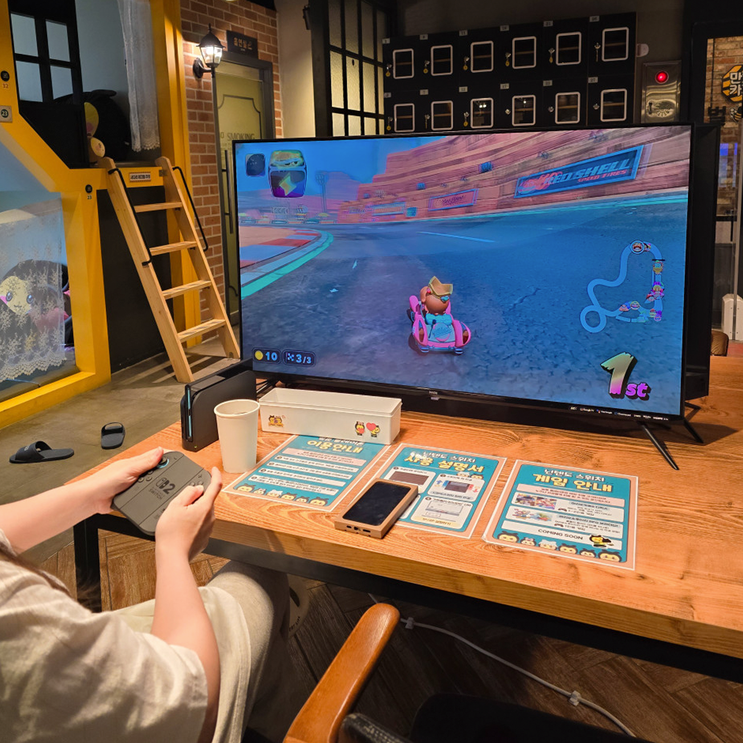 벌툰 엔틱 잠실새내점의 책장은 최신 인기작부터 신간, 웹툰 단행본, 유아만화까지 폭넓게 채워져 있다. 검색대를 통해 원하는 책을 바로 찾을 수 있는 점도 눈에 띈다. 만화책만 있는 것도 아니다. 보드게임, 닌텐도 스위치, 레트로 오락기까지 갖춘 플레이존은 남녀노소 누구나 즐길 수 있는 놀이터다. 영화 감상을 원한다면 ‘허니박스’ 룸에서 넷플릭스, 웨이브, 티빙 등 OTT 서비스까지 시청 가능하다. 각 방마다 문패 시스템이 있어 나만의 공간을 온전히 지킬 수 있는 점도 독특하다. 안마기, 쿠션, 전기장판 같은 편의용품이 제공되어 긴 시간을 보내도 지루할 틈이 없으며, 데이트나 친구 모임 장소로 제격이다.