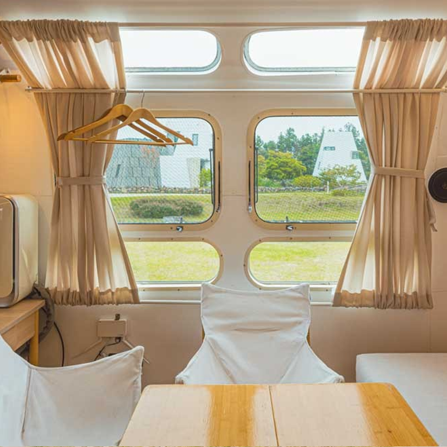 어라운드폴리의 매력은 단순히 예쁜 외관에 머물지 않는다. 세심한 배려와 디테일이 공간 곳곳에 숨어 있다. 현관 앞의 곡선 계단, 펠트 소재의 오거나이저, 캠핑책을 가죽 밴드로 감아 둔 미니 서가, 숙소마다 흘러나오는 음악까지—all 감각적이면서도 따뜻하다. 아이를 위한 목욕가운, 여행자를 위한 망원경 대여, 로비를 지키는 고양이 한 마리까지, 이곳의 모든 요소는 ‘사람의 온기’를 중심으로 만들어졌다.