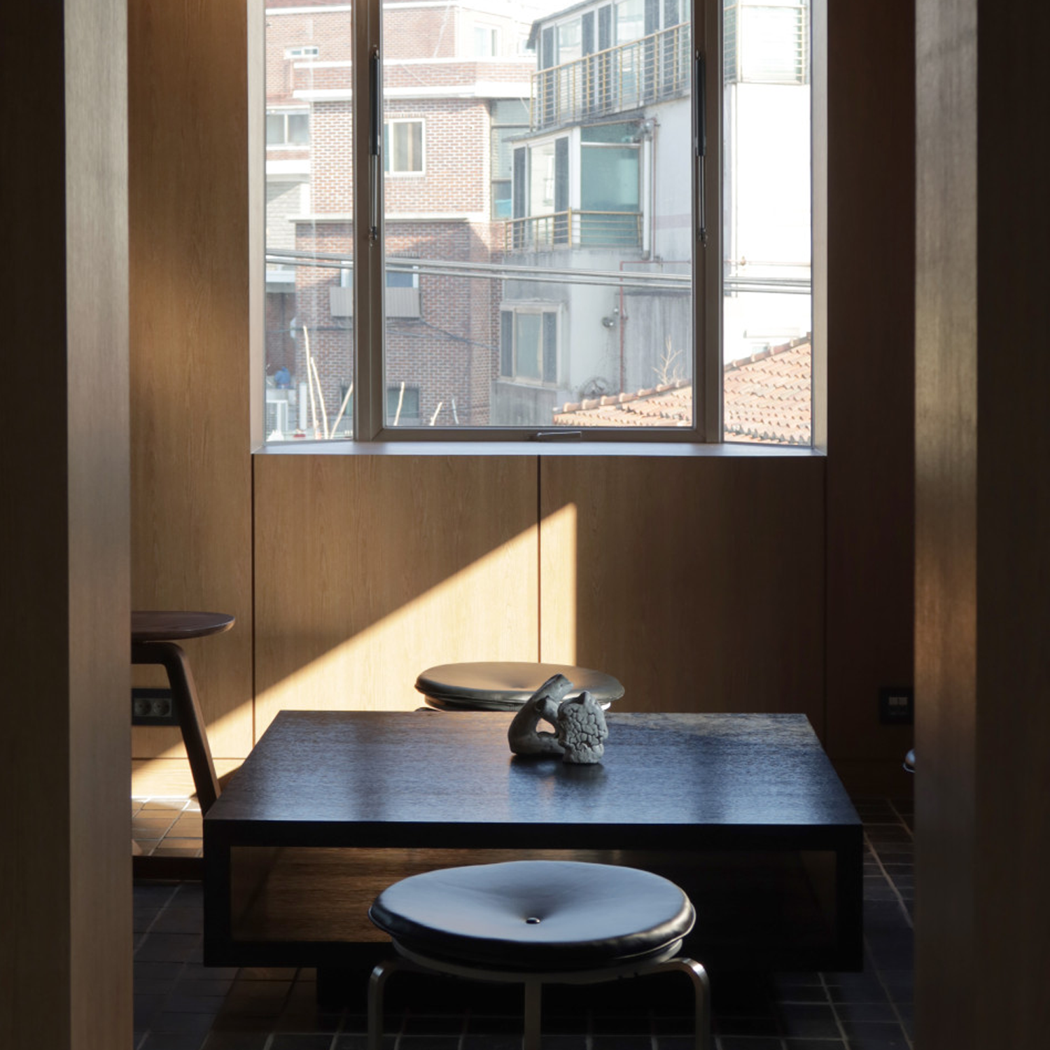 사람들의 발길이 잘 닿지 않는 낡은 동네, 기와가 남은 오래된 건물, 그리고 건물과 나란히 흐르는 한강. 조건만 놓고 보면 화려함과는 거리가 멀지만, 건축가는 그 한적함과 빈틈 속에서 새로운 공간의 가능성을 보았다고 합니다. 그래서 탄생한 것이 사무실과 건축서재, 누구든 쉬어갈 수 있는 카페가 공존하는 지금의 마하 한남입니다. 계단을 오를수록 한층씩 분위기가 달라지고, 마지막 층에서 문이 열리는 순간 조용히 펼쳐지는 한강의 창이 이곳의 첫인상을 완성합니다.